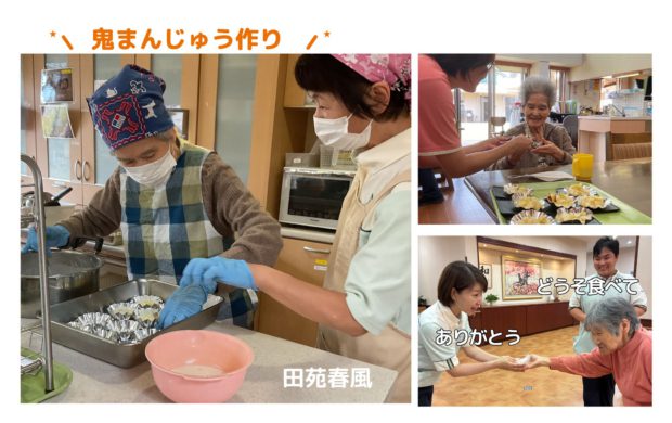 慣れた手つきで芋を切ったり、型に入れたりしながら入居者様と「昔よく子供と作った」「芋ばかり食べてた。」会話しながら作りました。少し多めに作ったため、本館社員にもおすそ分けに行きました。皆様に喜んでもらえて入居者様も大喜びで「喜んでくれて良かったね。また作ろうね」と楽しみました。 グループホーム田苑春風
