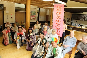 準備に30分以上もかかった自前のセットも大変本格的で、歌あり踊りありのショーの一員として衣装に着替えたご利用者やスタッフが一緒に参加すると観客の皆さんも大笑い!御年90歳のメインキャストいちのきさんから元気をわけていただけて楽しい一日となりました!