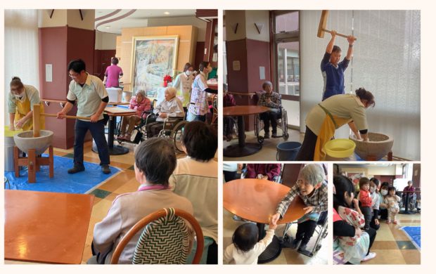 皆さんで「よいしょ!」という元気な掛け声を聞いているうちに、自然と若いころの記憶が蘇ります。重たい杵の感触に自然と背筋が伸び、職員と息を合わせ力いっぱいお餅をつくことができました。心も身体も若返ったようなひと時。晴れやかに活気あふれる一年の締めくくりとなりました。